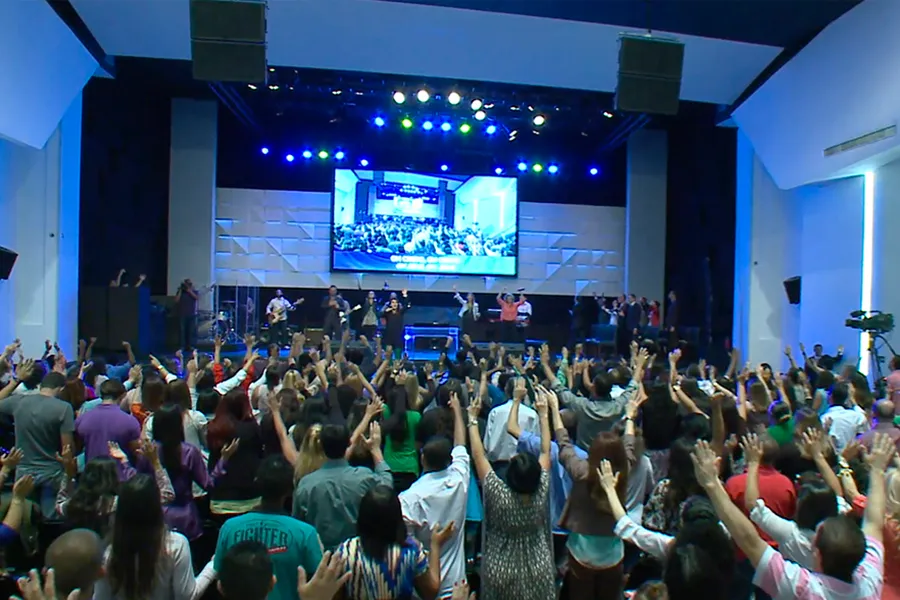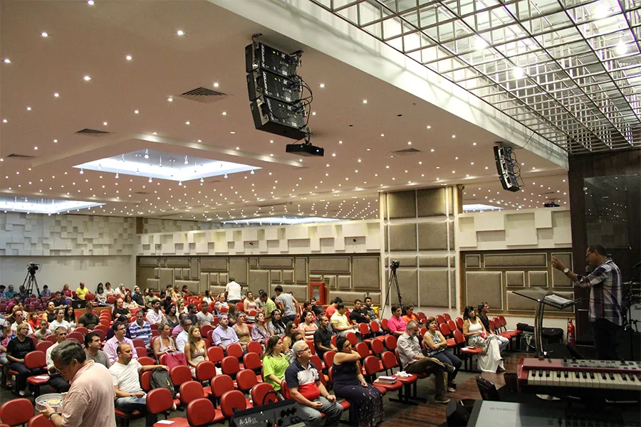 Não existe uma solução única. O sistema ideal varia conforme tamanho do ambiente, arquitetura, estilo musical, dinâmica litúrgica, quantidade de participantes e necessidade de cobertura uniforme.